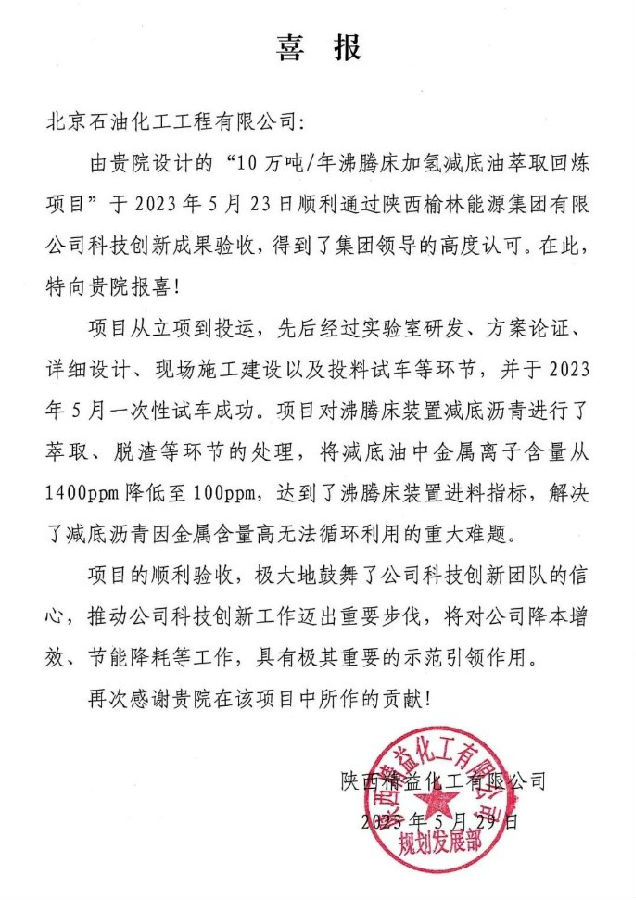 近日,由北京石油化工工程有限公司設(shè)計(jì)的陜西精益化工10萬(wàn)噸/年減底油萃取回?zé)掜?xiàng)目開車成功并通過業(yè)主驗(yàn)收,得到業(yè)主的高度認(rèn)可。該項(xiàng)目以沸騰床煤焦油加氫裝置的減底油渣為原料,回收其中可重復(fù)利用的組分,并將油渣中的膠質(zhì)/瀝青質(zhì)及金屬離子含量控制在一定范圍內(nèi),從而滿足沸騰床回?zé)挼倪M(jìn)料要求,為焦油加氫企業(yè)處理未轉(zhuǎn)化的油渣提供了一條全新途徑,大幅提升了企業(yè)經(jīng)濟(jì)效益。(通訊員/韓金奇)