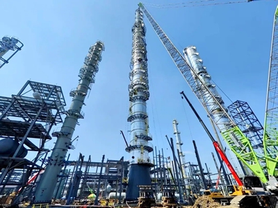 乙醇塔是本項(xiàng)目核心設(shè)備,直徑4.8米,高度116米,總重380噸,分4段進(jìn)場組對(duì)。尤其最后吊裝的上段設(shè)備長達(dá)25米、重達(dá)126噸,吊裝難度大,精度要求高。面對(duì)場地條件受限、惡劣天氣等不利因素,項(xiàng)目組與各參建方精心策劃、周密部署,通過科學(xué)管理,在38天窗口期內(nèi)高效完成包括超高、超重塔器及反應(yīng)器的安裝,為項(xiàng)目的全面推進(jìn)創(chuàng)造了有利條件。